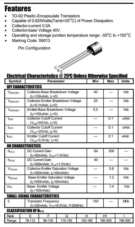 Transistor 9013 / S9013 | 2 Pack | 25V / 0.5A | NPN | TO-92 | CE-TRA-07