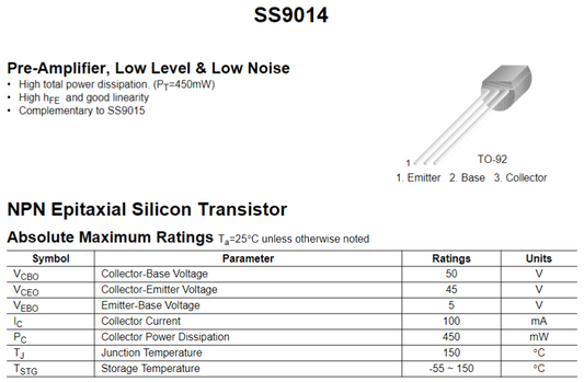 Transistor 9014 / S9014 | 2 Pack | 45V / 0.1A | NPN | TO-92 | CE-TRA-08
