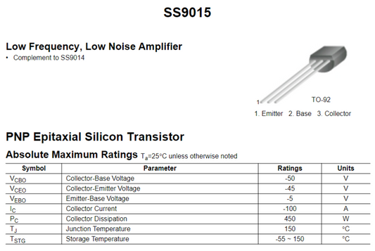 Transistor 9015 / S9015 | 2 Pack | 45V / 0.1A | PNP | TO-92 | CE-TRA-09
