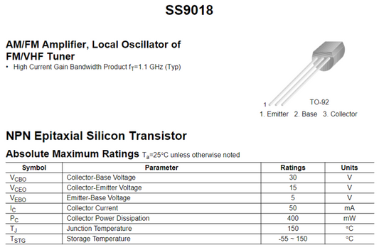 Transistor 9018 / S9018 | 2 Pack | 15V / 0.05A | NPN | TO-92 | CE-TRA-10
