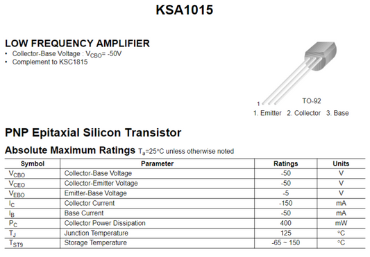 Transistor 2SA1015 / KSA1015 / A1015 | 2 Pack | 50V / 0.15A | PNP | TO-92 | CE-TRA-11