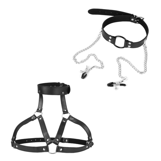Arnés de Pecho + Mordaza con Prensas para Pezones | BDSM | Cuerina + Metal | Ajustable | Negro | CJS-AR-07