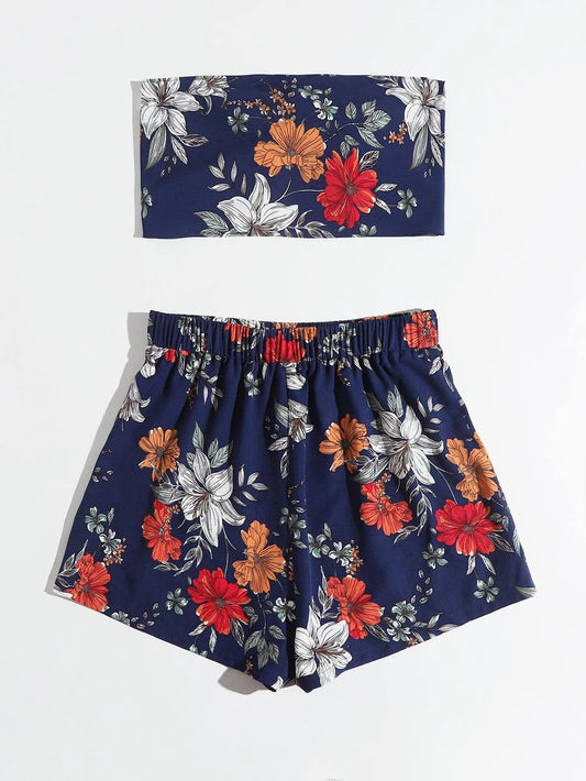 Conjunto | Top + Short | Azul - Floreado | M / L | Poliéster | CRD-CO-01