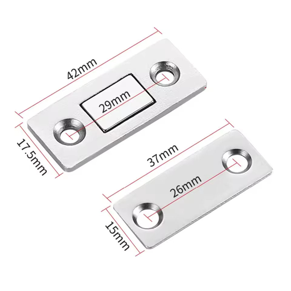 Ideal para gabinetes, puertas de cocina, armarios y muebles sin cerraduras visibles. Su diseño ultradelgado permite un cierre seguro y discreto, manteniendo las puertas en su lugar sin necesidad de manijas o pestillos voluminosos. Fácil instalación con tornillos incluidos.
